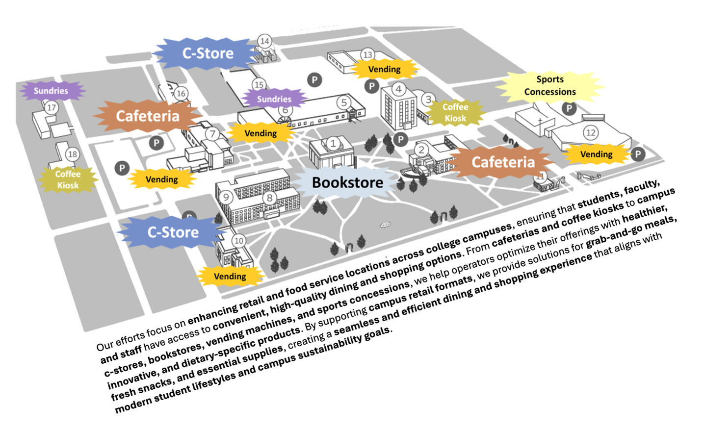 These decision-makers focus on retail food service programs, including branded coffee shops, campus stores, and quick-service options.